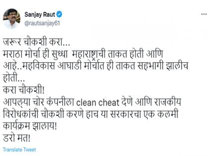 यानंतर आता संजय राऊतांनी ट्विट केलेल्या व्हिडिओवर सारवासारव करत, "जरूर चौकशी करा... मराठा मोर्चा सुद्धा महाराष्ट्राची ताकत होती आणि आहे.. महविकास आघाडी मोर्चात ही ताकत सहभागी झालीच होती... करा चौकशी!आपल्या चोर कंपनीला clean cheat देणे आणि राजकीय विरोधकांची चौकशी करणे हाच या सरकारचा एक कलमी कार्यक्रम झालाय! डरो मत!" असे म्हटले आहे.