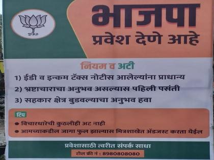 ‘भाजपात प्रवेश देणे सुरू आहे’ या मथळ्याखाली अटी आणि शर्ती देण्यात आल्या आहेत. 'ईडी व इन्कम टॅक्स नोटीस आलेल्यांना प्राधान्य, भ्रष्टाचाराचा अनुभव असल्यास पहिली पसंती, सहकार क्षेत्र बुडवल्याचा अनुभव' अशा तीन प्रमुख अटी बॅनरवर आहेत. याशिवाय तळटीपदेखील देण्यात आली आहे. 'विचारधारेची कुठलीही अट नाही. आमच्याकडील जागा फुल झाल्यास मित्र शाखेत अॅडजेस्ट करता येईल,' असा उल्लेख बॅनरवर आहे. बसस्थानक चौकात वर्दळीच्या ठिकाणी लावण्यात आलेला बॅनर अनेकांचे लक्ष वेधून घेत आहे. हा बॅनर नेमका कोणी लावला याची चर्चा सध्या परिसरात सुरू आहे.
