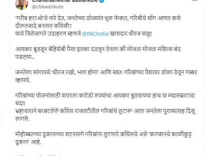 'गरीब हटाओ'चे नारे देत, जनतेच्या डोळ्यांत धूळ फेकत, गरिबीचे सोंग आणत कसे दौलतजादे बनतात काँग्रेसी? याचे जितेजागते उदाहरण म्हणजे खासदार धीरज साहू!. आयकर बुडवून बेहिशेबी पैसा इतका दडवून ठेवला की मोजता मोजता मशिन्स बंद पडल्या. जनतेला सांगायचे 'धीरज रखो, भला होगा' आणि स्वतः गरिबांच्या पैशावर डोळा ठेवून गब्बर व्हायचे. गरिबांच्या योजनांसाठी वापरला करोडो रुपयांचा आयकर बुडवायचा हाच या मद्यसम्राटाचा धंदा!. भ्रष्टाचाराने बरबटलेले काँग्रेस राजवटीतील गरिबांचे लुटारू आता जनतेला पुराव्यासह दिसू लागले, असे म्हणत बावनकुळे यांनी काँग्रेसवर निशाणा साधला.