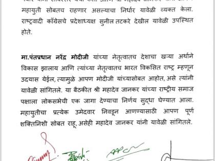 महादेव जानकर यांच्यासोबत झालेल्या बैठकीनंतर महायुतीच्या नेत्यांनी एक संयुक्त निवेदन जारी केलं असून त्यामध्ये म्हटलं आहे की, "पंतप्रधान नरेंद्र मोदीजी यांच्या नेतृत्वातच देशाचा खऱ्या अर्थाने विकास झालाय आणि त्यांच्या नेतृत्वातच भारत विकसित राष्ट्र म्हणून उदयास येईल, त्यामुळे आपण मोदीजी यांच्यासोबत आहोत, असं महादेव बैठकीत सांगितलं. या बैठकीत महादेव जानकर यांच्या राष्ट्रीय समाज पक्षाला लोकसभेची एक जागा देण्याचा निर्णय सुद्धा घेण्यात आला. महायुतीचा प्रत्येक उमेदवार निवडून आणण्यासाठी आपण पूर्ण शक्तिनिशी सोबत राहू, असंही महादेव जानकर यांनी यावेळी सांगितलं आहे," असं महायुतीच्या या संयुक्त निवेदनात म्हटलं आहे. या निवदेनाच्या खाली मुख्यमंत्री एकनाथ शिंदे, उपमुख्यमंत्री देवेंद्र फडणवीस, उपमुख्यमंत्री अजित पवार आणि महादेव जानकर यांचीही सही आहे.