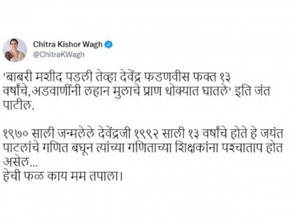 जयंत पाटील यांनी "बाबरी पाडली तेव्हा आपण त्या ठिकाणी होतो असा दावा देवेंद्र फडणवीस यांनी केला. 1992 साली फडणवीस अवघ्या 13 वर्षांचे होते. त्यावेली फडणवीस अयोध्येला गेले असतील तर हे गंभीर प्रकरण आहे. लालकृष्ण अडवाणी यांनी 13 वर्षांच्या बालकाला अयोध्येला नेऊन त्याचे प्राण धोक्यात घातले" असं म्हटलं होतं त्यावर आता "जयंत पाटलांचे हे गणित बघून त्यांच्या गणिताच्या शिक्षकांना पश्चाताप होत असेल" असं म्हणत चित्रा वाघ यांनी हल्लाबोल केला आहे. चित्रा वाघ यांनी आपल्या ट्विटर अकाऊंटवरून याबाबत एक ट्विट केलं आहे.