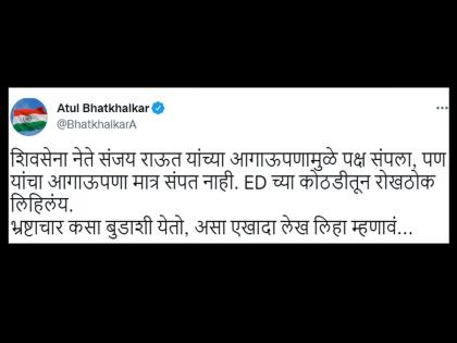 ईडीच्या फेऱ्यात अडकलेल्या संजय राऊतांना टोला लगावताना भातखळकर यांनी, "शिवसेना नेते संजय राऊत यांच्या आगाऊपणामुळे पक्ष संपला, पण यांचा आगाऊपणा मात्र संपत नाही. ED च्या कोठडीतून रोखठोक लिहिलंय. भ्रष्टाचार कसा बुडाशी येतो, असा एखादा लेख लिहा म्हणावं...," असे ट्विट केले आहे.