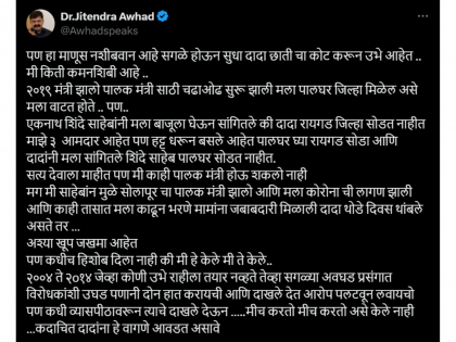 आव्हाडांनी 2019 मध्ये म्हणजेच महायुतीचे सरकार सत्तेत असतानाच एक किस्साही सांगितला आहे. ते म्हणाले की, "२०१९ मंत्री झालो. पालकमंत्रिपदासाठी चढाओढ सुरू झाली. मला पालघर जिल्हा मिळेल, असे मला वाटत होते; पण... एकनाथ शिंदे साहेबांनी मला बाजूला घेऊन सांगितले की दादा रायगड जिल्हा सोडत नाहीत. माझे ३ आमदार आहेत, ते पण हट्ट धरून बसले आहेत. पालघर घ्या रायगड सोडा आणि दादांनी मला सांगितले शिंदे साहेब पालघर सोडत नाहीत", असा गौप्यस्फोट जितेंद्र आव्हाड यांनी अजित पवारांबद्दल केला.