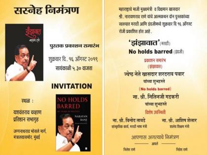मुंबई - गेल्या अनेक दिवसांपासून चर्चा असलेल्या माजी मुख्यमंत्री नारायण राणे यांच्या 'नो होल्ड्स बार्ड' या आत्मचरित्राच्या प्रकाशनाचा मुहूर्त ठरला असून, १६ ऑगस्ट रोजी मुंबईतील यशवंतराव चव्हाण प्रतिष्ठानच्या सभागृहात प्रकाशनाचा कार्यक्रम संपन्न होणार आहे. मुख्यमंत्री देवेंद्र फडणवीस हे नारायण राणे यांच्या पुस्तक प्रकाशनाला वेळ देत नसल्याने आता, राणेंच्या दोन पुस्तकांचे प्रकाशन खासदार शरद पवार आणि केंद्रीय मंत्री नितीन गडकरी यांच्या हस्ते होणार आहे.