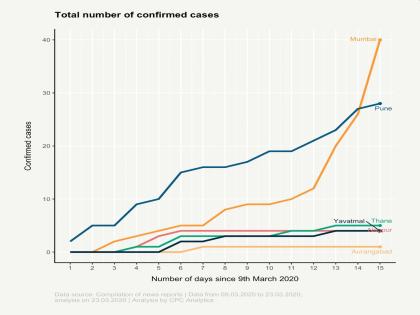 पण गेल्या काही दिवसांत सापडलेल्या कोरोनाग्रस्तांच्या आकडेवारीचा विचार केल्यास मुंबईकरांसाठी धोक्याची घंटा आहे. कारण मुंबईत गेल्या १५ दिवसांत ४० हून अधिक रुग्ण पॉझिटीव्ह सापडले आहेत. ही आकडेवारी पहिल्या १० रुग्णांनंतर नोंदविली गेलेली आहे. गेल्या चार दिवसांत १२ वरून हा आकडा ४० वर पोहोचला आहे. तर राज्यात यवतमाळ, नागपूर, औरंगाबाद आणि ठाण्यामध्ये एक दोन रुग्णांची भर पडली आहे. यामुळे कोरोनाचे केंद्र मुंबईअसून त्यांनंतर पुण्याचा क्रमांक लागत आहे. ही आकडेवारी सीपीसी अॅनॅलिटीक्स वरून घेतलेली आहे.