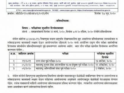 मुंबई - कोरोना विषाणूच्या संसर्गामुळे करण्यात आलेल्या लॉकडाऊनमुळे शालेय, माध्यमिक आणि इतर अभ्यासक्रमांच्या परीक्षा लांबणीवर टाकाव्या लागल्या आहे. महाराष्ट्र राज्य लोकसेवा आयोगाच्या नियोजित असलेल्या परीक्षाही कोरोनामुळे लांबणीवर टाकण्यात आल्या होत्या. आता हळूहळू लॉकडाऊन हटवण्यास सुरुवात झाल्यानंतर आता एमपीएससीकडून प्रलंबित परीक्षांचे वेळापत्रक आज प्रसिद्ध करण्यात आले आहे.