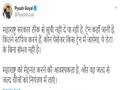 महाराष्ट्र सरकारची मागणी लक्षात घेऊन आम्ही त्यांना रेल्वे गाड्या पुरवल्या. आज दुपारी ३ पर्यंत ५० गाड्या सुटायला हव्या होत्या. मात्र केवळ १३ गाड्या सुटल्या. कारण राज्य सरकारनं आम्हाला मजुरांचा तपशीलच दिला नाही. अडकलेल्या मजुरांना त्यांच्या गावी परत पाठवण्यासाठी राज्य सरकारनं संपूर्ण सहकार्य करावं, असं आवाहन त्यांनी केलं. महाराष्ट्र सरकारनं आणखी उशीर करू नये. त्याचा परिणाम रेल्वेच्या जाळ्यावर आणि नियोजनावर होईल, असं गोयल यांनी ट्विटमध्ये म्हटलं.
