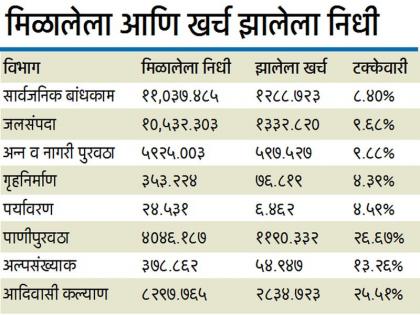 जलसंपदा विभागाला सर्वाधिक १०,५३२.३०३ कोटी म्हणजे ७६.५३ टक्के निधी मिळाला असताना, या विभागाने १३३२.८२० म्हणजे फक्त ९.६८ टक्केच निधी खर्च केला आहे.