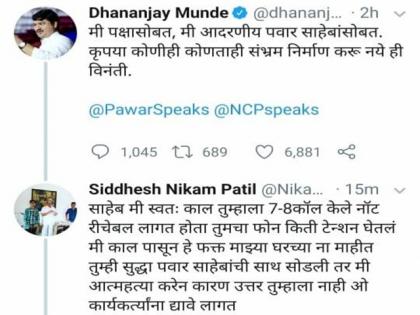 दरम्यान धनंजय मुंडे हे अजित पवारांच्या बंडात सामील असल्याचे वृत्त माध्यमांमध्ये आले होते. त्यानंतर धनंजय मुंडे यांनी आपण राष्ट्रवादी पक्षासोबत आणि शरद पवार यांच्यासोबतच असून कोणीही संभ्रम निर्माण करू नये, अशी पोस्ट ट्विटरवर शेअर केली होती. त्यावर लगेच प्रतिक्रिया सुरू झाल्या होत्या. एका कार्यकर्त्यांने ट्विटरवरच प्रतिक्रिया देताना धनंजय मुंडेंना सुनावले. साहेब मी स्वत: तुम्हाला सात ते आठ कॉल केले. तुमचा फोन नॉट रिचेबल होता. तुम्ही पवार साहेबांची साथ सोडली तर मी आत्महत्या करेल, कारण जनतेला उत्तर तुम्हाला नव्हे तर आम्हाला द्यावे लागतात, असंही कार्यकर्त्याने आपल्या प्रतिक्रियेत म्हटले आहे.