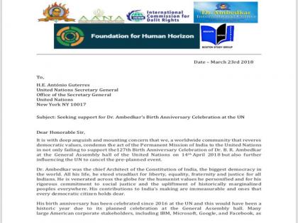 लोकमत ऑनलाइनकडे असलेल्या कागदपत्रांनुसार युनोचे महासचिव अँटिनिओ गुटेरेश यांना यासंदर्भात एक पत्रही पाठवण्यात आले आहे. २३ मार्च रोजी पाठवलेले हे पत्र इंटरनॅशनल कमिशन फॉर दलित राइट, फाऊंडेशन फॉर ह्युमन हॉरिझॉन, डॉ.बाबासाहेब आंबेडकर इंटरनॅशनल सेंटर, बोस्ट स्टडी ग्रुप या आणि अन्य संघटनांनी पाठवले आहे. या पत्रात युनोतील कायमस्वरुपी भारतीय राजदूत बाबासाहेबांच्या जयंती सोहळा आयोजनात सहकार्य करण्याऐवजी तो रद्द करण्यासाठी प्रभावित करत असल्याबद्दल निषेध करण्यात आला आहे. पत्रातील महत्त्वाचा मजकूर पुढीलप्रमाणे आहे.
