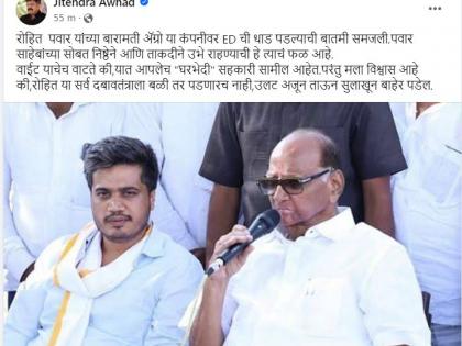 जितेंद्र आव्हाड यांनी यासंदर्भात सोशल मीडियावर एक पोस्ट शेअर केली आहे. त्यात आव्हाड यांनी रोहित पवार यांचा शरद पवार यांच्यासोबतचा एक फोटो शेअर केला आहे. या पोस्टमध्ये आव्हाड म्हणाले की, रोहित पवार यांच्या बारामती ॲग्रो या कंपनीवर ईडीची धाड पडल्याची बातमी समजली. रोहित पवार हे शरद पवार यांच्यासोबत निष्ठेने आणि ताकदीने उभे राहिले त्याचे हे फळ आहे. वाईट याचेच वाटते की, यात आपलेच "घरभेदी" सहकारी सामील आहेत. परंतु मला विश्वास आहे की, रोहित पवार हे या सर्व दबावतंत्राला बळी तर पडणारच नाहीत, उलट अजून ताऊन सुलाखून बाहेर पडतील.