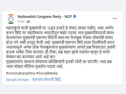 राष्ट्रवादी काँग्रेस पक्षाने आपल्या अधिकृत फेसबुक पेजवर एक स्क्रीनशॉट शेअर केला असून त्या माध्यमातून एकनाथ शिंदेंवर सडकून टीका करत सवाल केली. "महाराष्ट्राचे माजी मुख्यमंत्री उद्धव ठाकरे हे संवाद साधत नाहीत, असा आरोप करुन शिंदे गट महाविकास आघाडीतून बाहेर पडला. मात्र मुख्यमंत्रिपदाची शपथ घेतल्यानंतर मुख्यमंत्री एकनाथ शिंदेंनी स्वतःच्या फेसबुक पेजवर लोकांशी संवाद होऊ नये अशी तरतूद केली आहे. मुख्यमंत्री एकनाथ शिंदे सतत दिल्लीवारी करत असल्यामुळे अनेक लोक फेसबुकवरच मुख्यमंत्र्यांना आपले प्रश्न विचारतात. प्रसंगी कडक भाषेत टीका करतात. ही टीका, प्रश्न सहन झाले नसावेत म्हणून हे कमेंट सेक्शन बंद करण्यात आले आहे का? मुख्यमंत्र्यांना सामान्य लोकांच्या प्रतिक्रियांची इतकी भीती का वाटावी? असा प्रश्न आता सोशल मीडिया युजर्सना पडला आहे", अशा शब्दांत NCP च्या अधिकृत फेसबूक पेजवरून मुख्यमंत्री शिंदे यांना प्रश्न विचारण्यात आले.