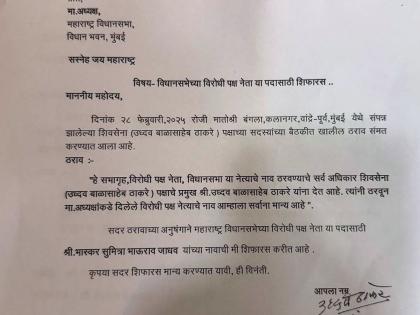 आज मातोश्रीवर झालेल्या शिवसेना उद्धव बाळासाहेब ठाकरे पक्षाच्या बैठकीत विरोधी पक्षनेतेपदासाठी नेत्याची निवड करण्याचे अधिकार पक्षप्रमुख उद्धव ठाकरे यांच्याकडे सुपूर्द करण्यात आले. त्यानंतर उद्धव ठाकरे यांनी विरोधी पक्षनेतेपदासाठी भास्कर जाधव यांच्या नावावर शिक्कामोर्तब केले. तसेच त्यांच्या नावाची विधिमंडळाकडे शिफारस करण्याची घोषणा केली.