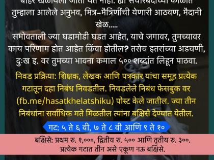 "कोरोना व्हायरसमुळे शाळा बंद आहेत. त्यामुळे मित्र-मैत्रिणी भेटत नाहीत, संचारबंदीमुळे घरात बसून राहावं लागतं, बाहेर खेळायला जाता येत नाही. ह्या संचारबंदीच्या काळात तुम्हाला आलेले अनुभव, मित्र-मैत्रिणींची येणारी आठवण, मैदानी खेळ... तसेच, सभोवताली ज्या घडामोडी घडत आहेत, याचे जगावर, तुमच्यावर काय परिणाम होत आहेत किंवा होतील? तसेच इतरांच्या अडचणी, दुःख." हे निबंधाचे विषय आहेत. या विषयांवर, कमाल ५०० शब्दांत आपल्या भावना लिहून पाठवायच्या आहेत.