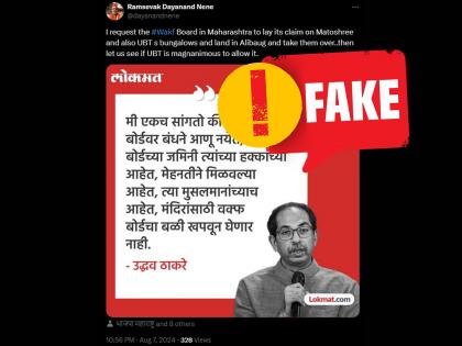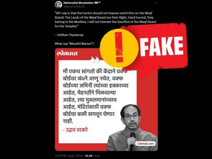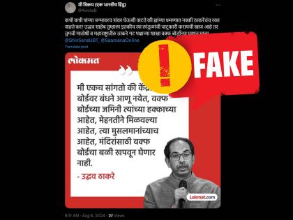 'लोकमत'च्या नावाने व्हायरल करण्यात आलेल्या क्रिएटिव्हमध्ये उद्धव ठाकरेंचा फोटो वापरण्यात आला असून त्यांनी वक्फ संशोधन विधेयकावरून सरकारवर टीका केल्याचं भासवण्यात आलं आहे. "मी एकच सांगतो की केंद्राने वक्फ बोर्डवर बंधने आणू नयेत, वक्फ बोर्डच्या जमिनी त्यांच्या हक्काच्या आहेत, मेहनतीने मिळवल्या आहेत, त्या मुसलमानांच्याच आहेत, मंदिरांसाठी वक्फ बोर्डचा बळी खपवून घेणार नाही," असं उद्धव ठाकरेंनी म्हटल्याचं या फेक क्रिएटिव्हमधून सुचवण्यात आलं आहे. परंतु हे क्रिएटिव्ह 'लोकमत'ने केलेलं नाही.