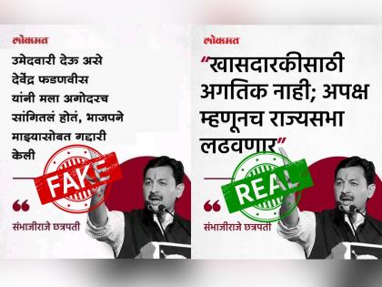 राज्यसभेच्या उमेदवारीवरून गेल्या काही दिवसांपासून खासदार संभाजीराजे छत्रपती यांचं नाव रोजच बातम्यांमध्ये आहे. शिवसेनेनं उमेदवारीसाठी त्यांच्यापुढे ठेवलेली अट, मुख्यमंत्री उद्धव ठाकरे आणि त्यांच्यात झालेली चर्चा, त्याआधी शरद पवारांनी त्यांना जाहीर केलेला पाठिंबा, त्यानंतर संभाजीराजेंनी मांडलेली भूमिका, या घडामोडींनी राजकीय वर्तुळात बराच धुरळा उडाला. या सगळ्या बातम्या 'लोकमत'ने कव्हर केल्या. हे अपडेट्स सोशल मीडियावरही शेअर केले. संभाजीराजेंची काही महत्त्वाची विधानं क्रिएटिव्ह्जच्या माध्यमातून पोस्ट केली. त्यापैकीच, एका क्रिएटिव्हवरील मजकूर बदलून, संभाजीराजे जे बोललेलेच नाहीत, असं विधान त्या फोटोवर टाईप आणि मॉर्फ करून काही जण ते व्हायरल करत आहेत. त्यावर 'लोकमत'चा लोगो असल्यानं आणि 'लोकमत' हे विश्वासार्ह नाव असल्यानं, बऱ्याच जणांना ते खरं वाटू शकतं. म्हणूनच, आम्ही आमच्या मूळ क्रिएटिव्हची लिंक आणि फेक इमेज दोन्ही आपल्यापुढे ठेवत आहोत.