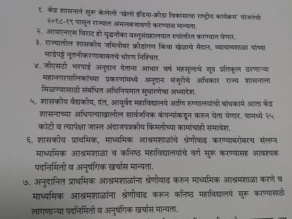 - शासकीय प्राथमिक, माध्यमिक आश्रमशाळांचे श्रेणीवाढ करण्याबरोबरच संलग्न माध्यमिक आश्रमशाळा व कनिष्ठ महाविद्यालयांचे वर्ग सुरू करण्यासह आवश्यक पदनिर्मिती व अनुषंगिक खर्चास मान्यता