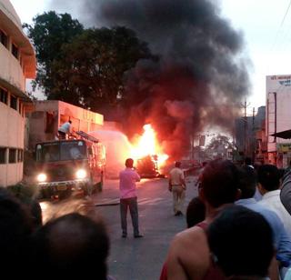सटाणा, दि. १० - नाशिकजवळील सटाणा येथे आज सकाळी सिलेंडर वाहून नेणारा कंटनेर डीव्हायडर चढून पलटी झाल्याने भीषण स्फोट झाला. आज सकाळी ६ च्या सुमारास झालेल्या या अपघातानंतर आत्तापर्यंत सहा सिलेंडरचा स्फोटो झाला आहे, मात्र सुदैवाने कोणतीही जीवितहानी झालेली नाही.