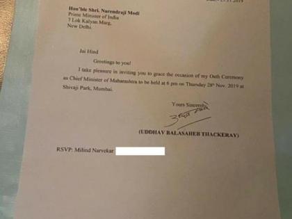 मुंबई - राज्यात शिवसेना-काँग्रेस-राष्ट्रवादी काँग्रेस या तीन पक्षांचे अर्थात महाविकास आघाडीचे सरकार स्थापन होऊ घातले आहे. शिवसेना पक्षप्रमुख उद्धव ठाकरे आज मुख्यमंत्रीपदाची शपथ घेण्यासाठी सज्ज झाले आहे. मात्र चर्चा त्यांच्या शपथविधीच्या आमंत्रण पत्रिकेचीच सुरू झाली आहे. उद्धव यांनी पंतप्रधान नरेंद्र मोदी यांना आमंत्रण दिले आहे.