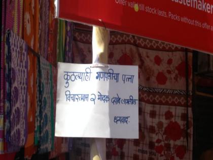 मानाच्या चौथ्या अर्थात तुळशीबाग गणपतीसमोर दरवर्षीप्रमाणे यंदाही भक्तांची रीघ लागली आहे. संपूर्ण राज्यभरातून मानाच्या गणपतींचे दर्शन घेण्यासाठी गर्दी होते. ही सर्व गणेश मंडळे जवळपासच्या अंतरावर असल्याने अनेकजण तुळशीबागेतील दुकानदारांना पत्ता विचारतात. गणपती काळात गौरी पूजन आणि हळदी-कुंकू असल्याने याकाळात तुळशीबाग ओसंडून वाहत असते. त्यामुळे अनेकदा पत्ते विचारणाऱ्यांचा कामात व्यत्यय येतो. अशावेळी थेट पत्ता विचारू नये अशी काहीशी उर्मट भाषा वापरण्यापेक्षा विक्रेत्यांनी विनोदी पाटी तयार केली आहे. त्यात 'कृपया कोणत्याही गणपतीचा पत्ता विचारू नये अन्यथा दोन मोदक द्यावे लागतील' असे लिहिले आहे. त्याही पलीकडे जात यात जे या पाटीचा फोटो त्यांना दोन मोदक अधिक द्यावे लागतील अशी सूचना आहे.