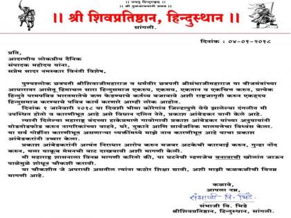 संभाजी भिडे यांनी पत्रकात म्हटलं आहे की, छत्रपती शिवाजी महाराज, छत्रपती संभाजी महाराज या बीजमंत्राच्या आधारावर राष्ट्रजागृती करण्याचे काम आम्ही करतो. "कोरेगाव भीमा येथे झालेल्या दंगलीत मी होतो व मी कारणीभूत आहे', असं विधान प्रकाश आंबेडकर यांनी केलं आहे. त्यांनी दिलेल्या महाराष्ट्र बंदच्या हाकेप्रमाणे गावोगावी त्यांच्या अनुयायांनी तोडफोड करून वाहने, घरे, दुकाने आणि सार्वजनिक मालमत्तेचा विध्वंस केला आहे. या सर्व गोष्टींना कारणीभूत असणाऱ्या व्यक्तींमध्ये माझे नाव कारणीभूत असल्याचे आंबेडकर बोलले आहेत. त्यांनी निराधार आरोप करून माझ्यावर अटकेची कारवाई करून गुन्हा नोंद करून, मला याकूब मेमनची वाट दाखवावी, अशी मागणी केली आहे.