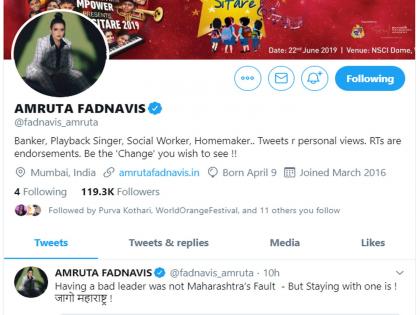 या पार्श्वभूमीवर अमृता यांनी एका वृत्तसंस्थेच्या ट्विटला रिट्विट करत उद्धव ठाकरेंवर अप्रत्यक्ष टीका केली आहे. वाईट नेता मिळणे ही महाराष्ट्राची चूक नाही, पण अशा नेत्यासोबत राहणे ही चूक आहे, असे म्हणत 'जागो महाराष्ट्र' अशी टिप्पणी केली आहे.