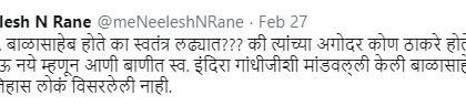 "स्व. बाळासाहेब स्वातंत्र्य लढ्यात होते का??? की त्यांच्या अगोदर कोण ठाकरे होते??? अटक होऊ नये म्हणून आणीबाणीत स्व. इंदिरा गांधीजींशी बाळासाहेबांनी मांडवली केली, तो इतिहास लोक विसरलेली नसल्याचं" म्हणत निलेश राणेंनी शिवसेनेवर हल्ला चढवला होता.