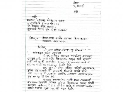 वंदनीय, पवार साहेब यांना सोनाली यांच्याकडून सप्रेम नमस्कार, मी एक अतिशय सामान्य परिस्थितीत असणाऱ्या घरातून आहे. माझे वडील रिक्षाचालक असून आई गृहिणी आहे. मी १२ वी इयत्तेनंतर चार्टर्ड अकाऊंटेट या कोर्ससाठी प्रवेश घेतला होता. CA-CPT ची प्रवेश परीक्षा उत्तीर्ण झाल्यानंतर पुढील शिक्षणासाठी मी पुण्यात राहायचं ठरवलं. त्यावेळी मी तुम्हाला आर्थिक सहाय्यता करण्याबद्दल एक पत्र लिहिलं होतं.