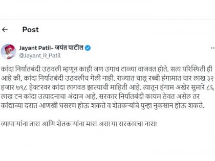 "राज्यात चालू रब्बी हंगामात चार लाख ३२ हजार ७९८ हेक्टरवर कांदा लागवड झाल्याची माहिती आहे. त्यातून हंगाम अखेर सुमारे ८६ लाख टन कांदा उत्पादनाचा अंदाज आहे. सरकार निर्यातबंदी कायम ठेवत असेल तर कांद्याच्या दरात आणखी घसरण होऊ शकते व शेतकऱ्यांचे पुन्हा नुकसान होऊ शकते. व्यापाऱ्यांना तारा आणि शेतकऱ्यांना मारा असा या सरकारचा नारा!" असं जयंत पाटील यांनी आपल्या ट्विटमध्ये म्हटलं आहे.