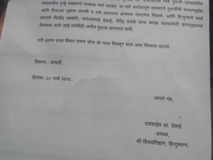 2. मिलिंद एकबोटे, धनंजय देसाई यांची खोट्या आरोपातून मुक्तता करावी.