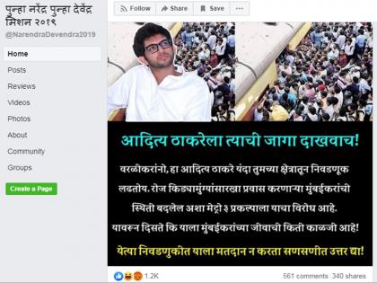 'पुन्हा नरेंद्र पुनः देवेंद्र मिशन 2019' या फेसबुक पेजवरून काँग्रेस-राष्ट्रवादी पक्षावर व त्यांच्या नेत्यांविरोधात पोस्ट करण्यात येतात. मात्र आता चक्क भाजपसोबत युती करणाऱ्या शिवसेनेच्या नेत्यांवर सुद्धा या पेजवरून टीका केली जात आहे. रोज किड्यामुंग्यांसारखा प्रवास करणाऱ्या मुंबईकरांची स्थिती बदलेल अशा मेट्रो 3 प्रकल्पाला आदित्यांचा विरोध आहे. त्यामुळे आदित्य ठाकरेंना त्यांची जागा दाखवाच असे आवाहन या पेजवरून करण्यात आले आहे.