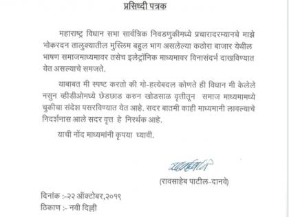 मुंबई : विधानसभा निवडणुकीच्या प्रचारदरम्यान भोकरदन तालुक्यातील एका ठिकाणी भाषण करताना जोपर्यंत मी आहे तोपर्यंत गोहत्या बंद होणार नसल्याचा विधान भाजपचे खासदार व केंद्रीय मंत्री रावसाहेब दानवे यांनी केल्याचा व्हिडिओ सोशल मिडियावर व्हायरल झाला आहे. मात्र गोहत्याबद्दल कोणतेही विधान केले नसून, त्या व्हिडिओमध्ये छेडछाड करण्यात आली असल्याचा दावा दानवे यांनी केला आहे. त्याबाबतचे त्यांनी प्रसिद्ध पत्रक काढले आहे.
