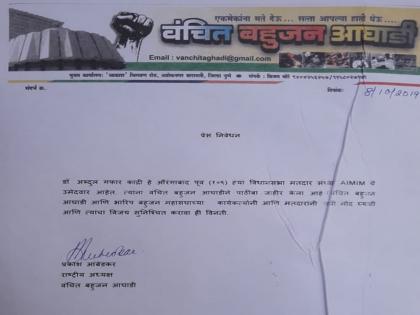 सन्मानपूर्वक जागा मिळत नसल्याने वंचित बहुजन आघाडीसोबतची युती तोडल्याचा खुलासा एमआयएमकडून करण्यात आला होता. त्यांनतर या दोन्ही पक्षाने आप-आपले उमेदवार रिंगणात उतरवले. त्यामुळे दोन्ही पक्षातील उमेदवार एकमेकांच्या विरोधात असल्याचे चित्र अनेक मतदारसंघात पहायला मिळत आहे. मात्र औरंगाबाद पूर्व मतदारसंघात वंचितकडून उमेदवार देण्यात आला नसल्याने त्यांनी एमआयएमच्या उमेदवाराला पाठिंबा दर्शवला आहे. विशेष म्हणजे असे पत्रकच आंबेडकर यांनी काढले आहे.