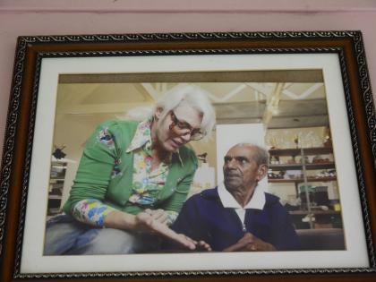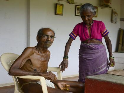 केतनचं बोलणं ऐकत पुढे गेलो तर फक्त लंगोट लावलेले स्वतः मशे खुर्चीत बसून कोयत्याने आंबा कापून खात बसले होते. फोटोतले मशे आणि हे यांच्यामध्ये भरपूर फरक जाणवला. मशे चांगलेच थकले आहेत. आम्ही आलो म्हटल्यावर घरातली सगळी मंडळी बाहेर आली. जिव्या मशेंचा धाकटा मुलगा बाळूही त्यात होते. मशेंना आणि तुम्हाला भेटायला आलो म्हटल्यावर सगळ्यांनी स्वागत केलं. मशेंना आता फारच कमी ऐकायला येतं, त्यामुळे मोठ्याने बोलायला लागत होतं. पण आमचं काहीच त्यांना समजत नव्हतं. त्यांना त्यांच्या वारली लोकांच्या भाषेची सवय होती. घरातले लोक त्यांना आमचं म्हणणं मोठ्याने ओरडून समजावत होते. थोडंफार बोलणं झाल्यावर बाळू यांच्याबरोबर आम्ही आत गेलो. सगळ्या घराच्या भिंती चित्रांनी आणि पुरस्कारांनी भरलेल्या होत्या.