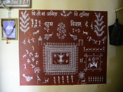 तारपा नृत्याचे ते प्रसिद्ध चित्र बाळू समजावून द्यायला लागले. दुधी भोपळ्यापासून आम्ही तारपा तयार करतो असे सांगत त्यांनी वाळवायला ठेवलेले दोन दुधी दाखवले. चित्रामध्ये एका बाजूला तारपा नृत्य होते. या चित्रात मध्यभागी असते ती वारलींची पालगुड देवी. लग्नात मदत करणाऱ्या सवाष्ण बायका, करवलीही त्यात असते. वाघ, मासे, मासेमारी करायची जाळी, झाडं असं वारलींच्या नेहमी आजूबाजूला असलेल्या गोष्टी त्यात चितारलेल्या होत्या. मशेंचं एक मासेमारीचं चित्रही चांगलंच प्रसिद्ध झालं , ते सुद्धा पाहायला मिळालं. आजकाल शहरात वारली चित्रे रंगाने कागदावर काढली जात असली तरी मशे आणि त्यांची मुलं, नातवंडं तांदळाच्या पिठाने आणि ब्रशऐवजी काडीने चित्रं काढतात. बाळू सध्या वारुळाचं एक सुंदर चित्र काढत आहेत. म्हटलं जिव्या अजूनही चित्र काढतात का? तर ते म्हणाले, "नाही! आता फारसं नाही जमत त्यांना! हात थरथरतात त्यांचे. तरिही त्यांच्या डोक्यात ही सगळी चित्र आहेत. चित्रांच्या कल्पना डोक्यात येत असतात. आज सकाळीच मला कागद आणि पिठ कालवलेला डबा दे म्हणत होते. "