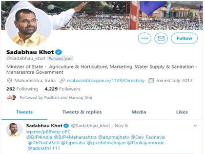 मात्र राज्यातील माजी कृषीमंत्री असलेले डॉ. अनिल बोंडे आणि कृषी राज्यमंत्री सदाभाऊ खोत यांनी ट्विटरवर अद्यापही नावापुढे मंत्रिपदाचा उल्लेख कायम ठेवल्याने विरोधकांकडून त्यांच्यावर टीका होत आहे. राज्यात कोणत्याही पक्षाचं सरकार स्थापन होत नाही त्यामुळे राज्यपालांच्या शिफारशीनंतर राज्यात राष्ट्रपती राजवट लागू करण्यात आली आहे. राष्ट्रपती राजवट सुरु असल्याने राज्याचा कारभार राज्यपालांच्या अधिपत्याखाली गेलेला आहे. राज्याचे प्रमुख म्हणून राज्यपाल काम सांभाळत आहेत.