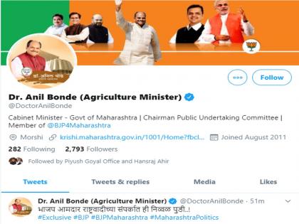 डॉ. अनिल बोंडे आणि कृषी राज्यमंत्री सदाभाऊ खोत यांनी ट्विटरवर अद्यापही नावापुढे मंत्रिपदाचा उल्लेख कायम ठेवल्याने विरोधकांकडून त्यांच्यावर टीका होत आहे.