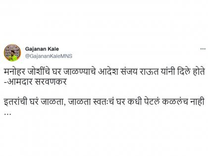 "इतरांची घरं जाळता, जाळता स्वतःचं घर कधी पेटलं कळलंच नाही" असं म्हणत मनसेना हल्लाबोल केला आहे. मनसेचे प्रवक्ते गजानन काळे (MNS Gajanan Kale) यांनी आपल्या ट्विटर अकाऊंटवरून याबाबत एक ट्विट केलं आहे. "मनोहर जोशींचे घर जाळण्याचे आदेश संजय राऊत यांनी दिले होते असं आमदार सरवणकर यांनी म्हटलं आहे. इतरांची घरं जाळता, जाळता स्वतःचं घर कधी पेटलं कळलंच नाही" असं गजानन काळे यांनी ट्विटमध्ये म्हटलं आहे. तसेच अहो पण आता राहिलय कोण? असं म्हणत एक व्यंगचित्रही शेअर केलं आहे.