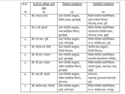 एटीएस प्रमुख सदानंद दाते आणि ठाणे पोलीस आयुक्त जयजीत सिंह यांना महासंचालक पदावर बढती देत ते सध्या कार्यरत असलेले पद उन्नत करुन त्याच ठिकाणी नियुक्ती दिली आहे. तर, अपर पोलीस महासंचालक बिपिन कुमार सिंह (आर्थिक गुन्हे महाराष्ट्र) यांची महाराष्ट्र राज्य सुरक्षा महामंडळ येथे व्यवस्थापकीय संचालक म्हणून नियुक्ती केली आहे. तर मनोज लोहिया यांना छत्रपती संभाजीनगर इथं पोलीस आयुक्त बनवण्यात आले आहे.
