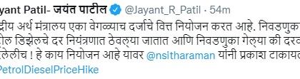 "केंद्रीय अर्थ मंत्रालय एका वेगळ्याच दर्जाचे वित्त नियोजन करत आहे. निवडणुका आल्या की पेट्रोल डिझेलचे दर नियंत्रणात ठेवल्या जातात आणि निवडणुका गेल्या की दरवाढ ही ठरलेलीच ! हे काय नियोजन आहे यावर अर्थमंत्री निर्मला सीतारामन यांनी प्रकाश टाकायला हवा," हवं असं जयंत पाटील म्हणाले.