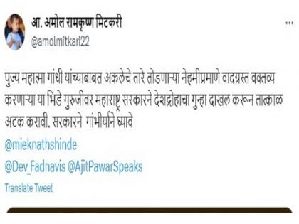 संभाजी भिडेंच्या या विधानावरून आता राजकारण चांगलेच तापले असून राष्ट्रवादी कॉंग्रेसचे आमदार अमोल मिटकरी यानी त्यांच्या अटकेची मागणी केली आहे. "पुज्य महात्मा गांधी यांच्याबाबत अकलेचे तारे तोडणाऱ्या नेहमीप्रमाणे वादग्रस्त वक्तव्य करणाऱ्या या भिडे गुरुजीवर महाराष्ट्र सरकारने देशद्रोहाचा गुन्हा दाखल करून तात्काळ अटक करावी. सरकारने गांभीर्याने घ्यावे", अशा आशयाचे ट्विट मिटकरी यांनी केले आहे.