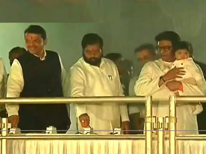 मुंबई - महाराष्ट्राच्या राजकारणात मनसे अध्यक्ष राज ठाकरे, मुख्यमंत्री एकनाथ शिंदे आणि उपमुख्यमंत्री देवेंद्र फडणवीस यांची जवळीक वाढल्याचे दिसून येत आहे. यातच, आज मनसेकडून शिवाजी पार्कवर करण्यात आलेल्या दीपोत्सवाच्या कार्यक्रमात हे तीनही नेते एकत्र आल्याने राज्याच्या राजकीय वर्तुळात चर्चांना उधाण आले आहे. यावेळी मनसेच्या दीपोत्सवाचे उद्घाटन मुख्यमंत्री एकनाथ शिंदे यांच्या हस्ते करण्यात आले. यावेळी राज यांच्याकडून मुंख्यमंत्र्यांचा सत्कारही करण्यात आला. यानंतर मैदानावर फटाक्यांची जबरदस्त आतशबाजीही बघायला मिळाली.