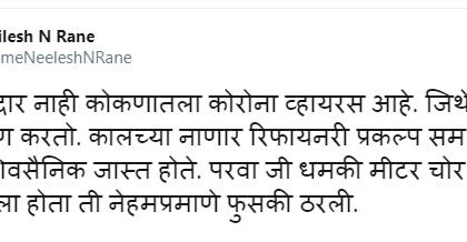 निलेश राणे यांनी ट्वीट करत म्हटलं आहे की, "हा खासदार नाही कोकणातला कोरोना व्हायरस आहे. जिथे जातो तिथे घाण करतो. कालच्या नाणार रिफायनरी प्रकल्प समर्थनाच्या सभेत शिवसैनिक जास्त होते. परवा जी धमकी मीटर चोर राऊत देऊन गेला होता, ती नेहमप्रमाणे फुसकी ठरली" असल्याचा खोचक टोला त्यांनी यावेळी लगावला.