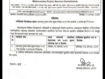 मुंबई - महाराष्ट्र लोकसेवा आयोगामार्फत घेण्यात येणाऱ्या महाराष्ट्र दुय्यम सेवा मुख्य परीक्षा (STI main paper) 2019 चा मुख्य पेपर क्रमांक 2 राज्यातील पुरपरिस्थितीमुळे पुढे ढकलण्यात आला आहे. त्यामुळे, रविवारी 11 ऑगस्ट रोजी सकाळी 10 वाजता घेण्यात येणारी परीक्षा रद्द करण्यात आली आहे. याबाबत आयोगाने परिपत्रक जारी करुन माहिती दिली.