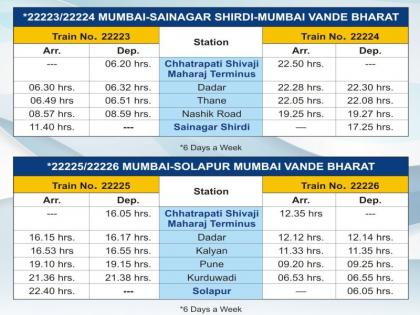 ट्रेन क्रमांक २२२२३ मुंबई-साईनगर शिर्डी वंदे भारत एक्स्प्रेस सकाळी ६.२० वाजता सीएसएमटीहून सुटेल आणि साईनगर शिर्डी येथे ५ तास २० मिनिटे घेऊन सकाळी ११.४० वाजता पोहोचेल. सीएसएमटी निघणारी ही गाडी दादर, ठाणे, नाशिक रोड स्थानकावर थांबेल.तर ट्रेन क्रमांक २२२२४ साईनगर शिर्डी-मुंबई वंदे भारत एक्स्प्रेस साईनगर शिर्डी येथून सायंकाळी ५.२५ वाजता सुटेल आणि ५ तास २५ मिनिटे घेत मुंबईला रात्री १०.५० वाजता पोहोचेल.