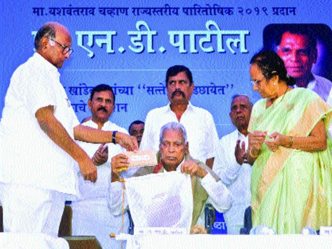 क-हाड (जि. सातारा) : ‘कर्मवीर भाऊराव पाटील यांनी स्थापन केलेल्या रयत शिक्षण संस्थेचे वटवृक्षात रुपांतर झाले आहे. समाजातील प्रत्येक घटक शिक्षणाच्या प्रवाहात आला पाहिजे, त्यांना शिक्षण मिळाले पाहिजे, असे स्वप्न त्यांनी पाहिले. तर प्रा. डॉ. एन. डी. पाटील यांनी रयत शिक्षण संस्थेमार्फत महाराष्ट्राच्या शिक्षण क्षेत्रात लक्षणीय कामगिरी केली. कर्मवीरांनी पाहिलेले स्वप्न त्यांच्यानंतर एन. डी. पाटील यांनी कृतीतून करून दाखविले,’ असे प्रतिपादन राष्ट्रवादीचे अध्यक्ष शरद पवार यांनी केले.कºहाड येथील संत गाडगे महाराज महाविद्यालयात सोमवारी यशवंतराव चव्हाण प्रतिष्ठानच्यावतीने ‘यशवंतराव चव्हाण राज्यस्तरीय पुरस्कार’ शरद पवार यांच्या हस्ते प्रा. डॉ. एन. डी. पाटील व पत्नी सरोजताई पाटील यांना प्रदान करण्यात आला. खासदार श्रीनिवास पाटील, डॉ. अनिल काकोडकर, राम खांडेकर, अरुण गुजराथी, ज्येष्ठ लेखक जब्बार पटेल, आमदार बाळासाहेब पाटील, दिलीप माजगावकर, डॉ. सदानंद बोरसे, प्राचार्य डॉ. मोहन राजमाने उपस्थित होते. यावेळी राम खांडेकर लिखित ‘सत्तेच्या पडछायेत’ या पुस्तकाचे प्रकाशन करण्यात आले.सत्काराला उत्तर देताना एन. डी. पाटील यांनी रयत शिक्षण संस्थेचे मोलाचे सहकार्य लाभल्याचे सांगितले. पुरस्कारासाठीपोटी मिळालेल्या दोन लाखांपैकी एक लाख रुपये रयत शिक्षण संस्था आणि एक लाख रुपये इचलकरंजी येथे वाचनालय इमारतीसाठी देत असल्याचेही त्यांनी जाहीर केले.यशवंतराव चव्हाण यांना अभिवादनआधुनिक महाराष्ट्राचे शिल्पकार यशवंतराव चव्हाण यांच्या स्मृतिदिनी सोमवारी शहरात विविध उपक्रमांचे आयोजन केले होते. प्रीतिसंगमावरील त्यांच्या स्मृतिस्थळी राष्ट्रवादीचे अध्यक्ष शरद पवार यांच्यासह अनेक मान्यवरांनी अभिवादन केले.