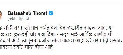 यावर थोरात यांनी केंद्र सरकारवर टीका केली आहे. नरेंद्र मोदी सरकारने पाच वर्षात देश दिवाळखोरीत काढला आहे. या सरकारला कुठलेही धोरण वा दिशा नसल्यामुळे आर्थिक आणीबाणी ओढवली आहे. त्यातूनच कर्जाचा बोजा वाढला आहे. खरे तर मोदी सरकारच देशावरचा सर्वात मोठा बोजा आहे, अशी टीका थोरात यांनी केली.