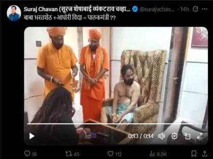 महायुतीचा घटक पक्ष असलेल्या राष्ट्रवादी काँग्रेस पक्षाचे प्रवक्ते सूरज चव्हाण यांनी हा नवीन व्हिडिओ पोस्ट केला आहे. व्हिडिओमध्ये एक अघोरी बाबा मंत्रोच्चार करताना दिसत आहे, तर भरत गोगावले पूजेमध्ये सहभागी झालेले दिसत आहेत. बाबा भरतशेठ + आघोरी विद्या = पालकमंत्री ?? असं कॅप्शन सूरज चव्हाण यांनी या व्हिडीओला दिलं आहे. रायगडचे पालकमंत्रीपद मिळविण्यासाठी गोगावले यांनी अघोरी पूजा केल्याचा आरोप सूरज चव्हाण यांनी केलाय.
