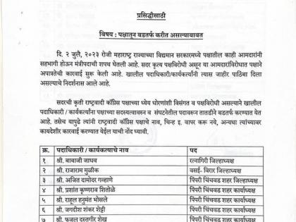 ही कारवाई करताना राष्ट्रवादी काँग्रेस पक्षाने एक पत्रक प्रसिद्ध केलं असून, त्यात म्हटलं आहे की, महाराष्ट्र राज्याच्या विद्यमान सरकारमध्ये सामील होणाऱ्या व उपमुख्यमंत्री/मंत्री पदाची शपथ घेतलेल्या पक्षाच्या आमदारांच्या शपथविधीसाठी २ जुलै २०२३ रोजी पुढील यादीनुसार विविध पदाधिकारी व कार्यकर्ते उपस्थित राहिले. या सर्वांचे कृत्य पक्ष शिस्त तसेच पक्षाची ध्येयधोरणे याच्या विरोधी आहे. त्यामुळे त्यांना पक्षाच्या प्राथमिक सदस्यत्वावरून व संघटनेतील पदावरून तातडीने बडतर्फ करण्यात येत आहे.