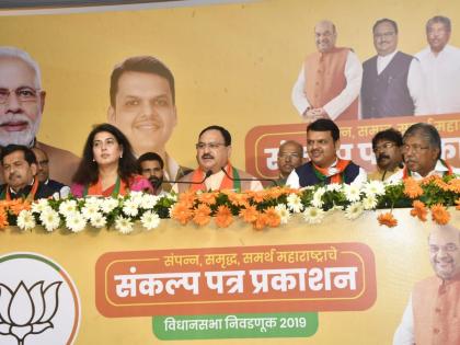 मुंबई : राज्यात येत्या पाच वर्षांत एक कोटी रोजगार निर्मिती, प्रत्येक बेघराला घर, ३० हजार किलोमीटरचे रस्ते, अशा अनेक आश्वासनांचा वर्षाव भाजपने आपल्या संकल्पपत्रात केला आहे. मुख्यमंत्री देवेंद्र फडणवीस आणि भाजपचे कार्याध्यक्ष जे.पी.नड्डा यांनी हे संकल्पपत्र मंगळवारी जाहीर केले.